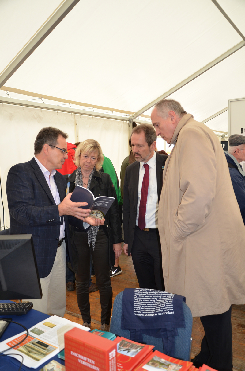 Doris Ahnen, Wissenschaftsministerin des Landes Rheinland-Pfalz, und mit ihr zahlreiche Besucher nutzten die Gelegenheit, sich auf dem diesjährigen Wissenschaftsmarkt über die Arbeit der Akademie und speziell über zwei ihrer Projekte zu informieren: Das ›Digitale Familiennamenwörterbuch Deutschlands‹ stellte gemeinsam mit dem Projekt ›Deutscher Familiennamenatlas‹ einem nicht nachlassenden Strom von familiengeschichtlich Interessierten spannende Informationen, wie Verbreitungskarten des eigenen Familiennamens, zur eigenen Biographie bereit. Die Mitarbeiter der ›Deutschen Inschriften‹ informierten über zwei aus diesem Forschungsvorhaben entstandene außergewöhnliche Projekte: Dabei handelt es sich um ›St. Stephan virtuell‹ – einen internetgestützten Panorama-Rundgang mit Informationen zu 1000 Jahren Stift und Kirche St. Stephan in Mainz und das in Kooperation mit dem Deutschen Historischen Institut in Rom durchgeführte Projekt ›Edition der Inschriften der »deutschen« Nationalkirche in Rom, S. Maria dell’Anima‹. Begleitend dazu konnten sich die Besucher mit dem Erkennen gotischer Buchstaben und arabischer Ziffern sowie dem Auflösen mittelalterlicher Inschriftenformeln spielerisch mit dem wissenschaftlichen Handwerkszeug der Forscher auseinandersetzen, ein Angebot, das Jugendliche wie Erwachsene begeistert nutzten; Malaktionen für Kinder rundeten das Angebot ab.