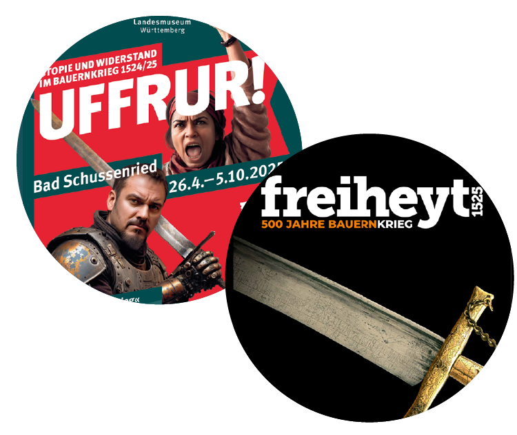 Plakat zur Bad Schussenrieder Landesausstellung ›UFFRUR! Utopie und Widerstand im Bauernkrieg 1524/25‹ (links), Plakat zur Thüringer Landesausstellung ›freiheyt 1525. 500 Jahre Bauernkrieg‹ (rechts).