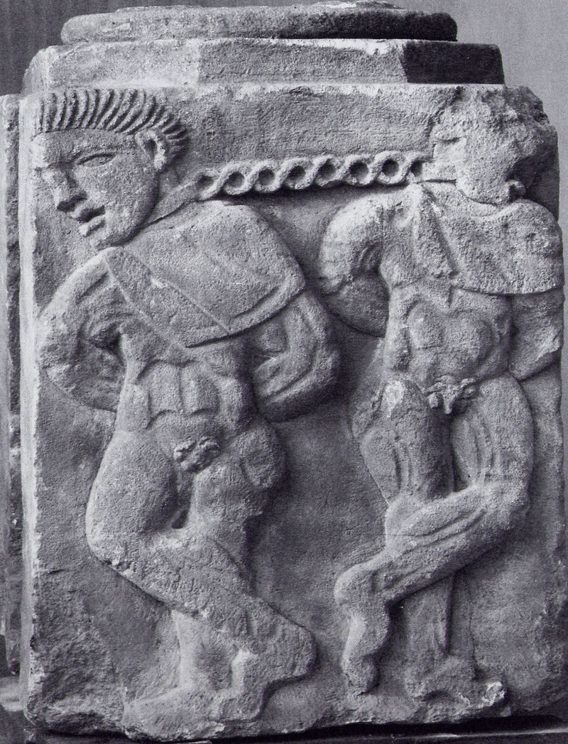 ›Kriegsgefangene Barbaren‹. Säulensockel einer Wandelhalle flavischer Zeit (Fundort: Mainz, Kästrich; jetzt: Landesmuseum Mainz, Foto: Johannes Deißler).