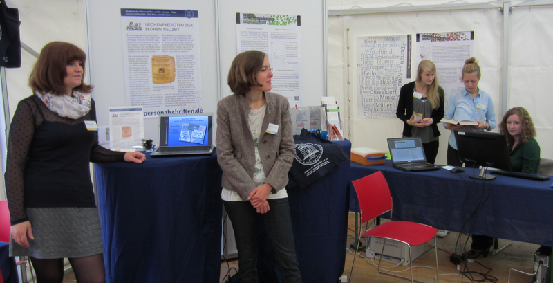 Am vergangenen Wochenende präsentierte sich die Akademie der Wissenschaften und der Literatur, vertreten durch ihre Projekte das ›Digitale Familiennamenwörterbuch Deutschland‹ und die ›Forschungsstelle für Personalschriften‹, dem interessierten Publikum. Die Besucher des 13. Mainzer Wissenschaftsmarkt hatten Gelegenheit sich über die Verbreitung ihres Familiennamens zu informieren, dokumentieren ließ sich dies durch den Ausdruck von entsprechenden Verbreitungskarten. Unter dem Titel ›Über(-)Leben auf Papier‹ stellte Birthe zur Nieden von der Forschungsstelle für Personalschriften beispielhafte Lebensläufe aus Leichenpredigten vor.