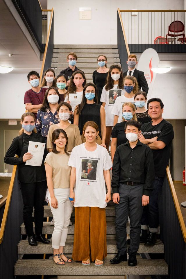 Im Zeichen des Beethoven-Jubiläums standen die diesjährige internationale Sommerschule ›Singing Summer‹ und die Beethoven-Akademie der Hochschule für Musik Mainz. Im Anschluss an die beiden Finalkonzerte vor internem Publikum wurden die Gewinnerinnen und Gewinner der Preise verkündet, auf die sich die Fachjury nach langem Ringen einigen konnte. Ausdrücklich lobte Prof. Lutz die hervorragende Qualität und das hohe Niveau aller Teilnehmenden, die dazu geführt hätten, dass die Auswahl der Preisträgerinnen und Preisträger äußerst schwergefallen war. Etwas Erleichterung in der schwierigen Entscheidung brachten die Sponsoren der Preise, indem sie spontan weitere Förderpreise zusätzlich zu den ausgeschriebenen im Gesamtwert von bereits 7.500 € hinzufügten, sodass schließlich acht Preise vergeben werden konnten.