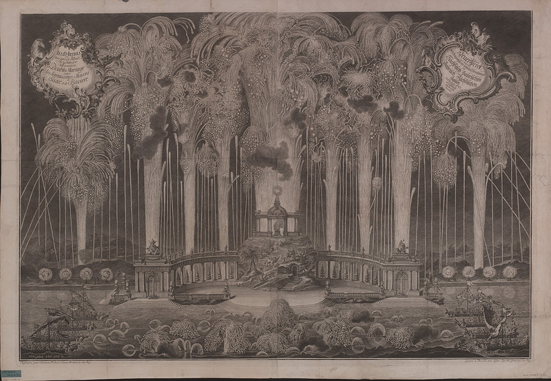 Ansicht des Feuerwerks zur Vermählung in Dresden-Pillnitz, Kupferstich von Lorenzo Zucchi nach einer Zeichnung von Christian Friedrich Exner. 1747. SLUB Dresden
