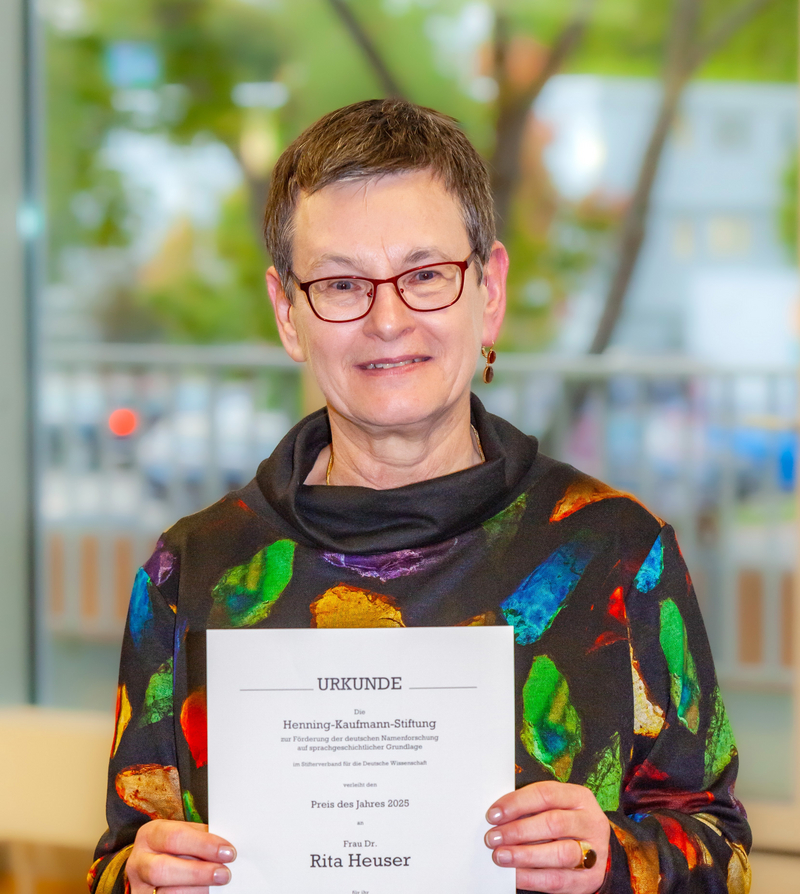 For her achievements in the field of name research, Dr Rita Heuser, department head of the academy project 'Das Digitale Familiennamenwörterbuch Deutschlands (DFD)' (The Digital Dictionary of German Family Names), received this year's annual award from the Henning Kaufmann Foundation for the Promotion of German Name Research on a Linguistic-Historical Basis. The award ceremony and keynote speech took place on 29 September 2025 at the Academy of Sciences and Literature in Mainz.