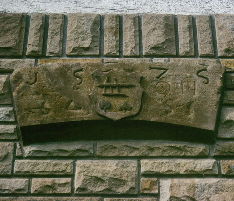 Neufund: Ehemaliger Scheitelstein eines Torbogens, der heute als Spolie in eine Hauswand eingelassen wurde.