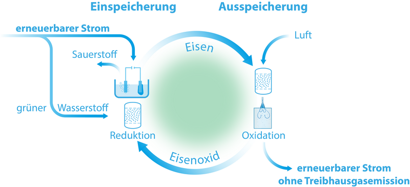 Eisen kann als feines Pulver verbrannt werden. Dabei wird Wärme, aber kein klimaschädliches Kohlendioxid (CO2) freigesetzt (Ausspeicherung chemisch gebundener Energie). Die Wärme kann genutzt werden, um wie in konventionellen Kraftwerken mittels Dampfturbine und Generator Strom zu erzeugen. Nach der Verbrennung ist aus dem Eisen Eisenoxid geworden, also Rost. Dieser liegt als ein Pulver vor, das wegen der Reaktion mit dem Luftsauerstoff ein wenig größere und um 40% schwerere Körner aufweist. Dieses Eisenoxidpulver lässt sich aus dem Abgas abscheiden und sammeln. Das ist eine entscheidende Eigenschaft, denn das gesammelte Eisenoxidpulver kann wiederverwendet werden. Unter Nutzung erneuerbarer Energie wird der Verbrennungsprozess rückgängig gemacht, chemisch gesprochen wird es reduziert (Einspeicherung von erneuerbaren Energien in das Eisen). Damit wird wieder das ursprüngliche Eisenpulver hergestellt. Dies kann je nach Bedarf, z.B. im Winter, in einem Kraftwerk verbrannt werden, um Strom zu erzeugen, wenn die Sonne kaum scheint. Eisen kann also in einem Zyklus wiederverwendet werden!