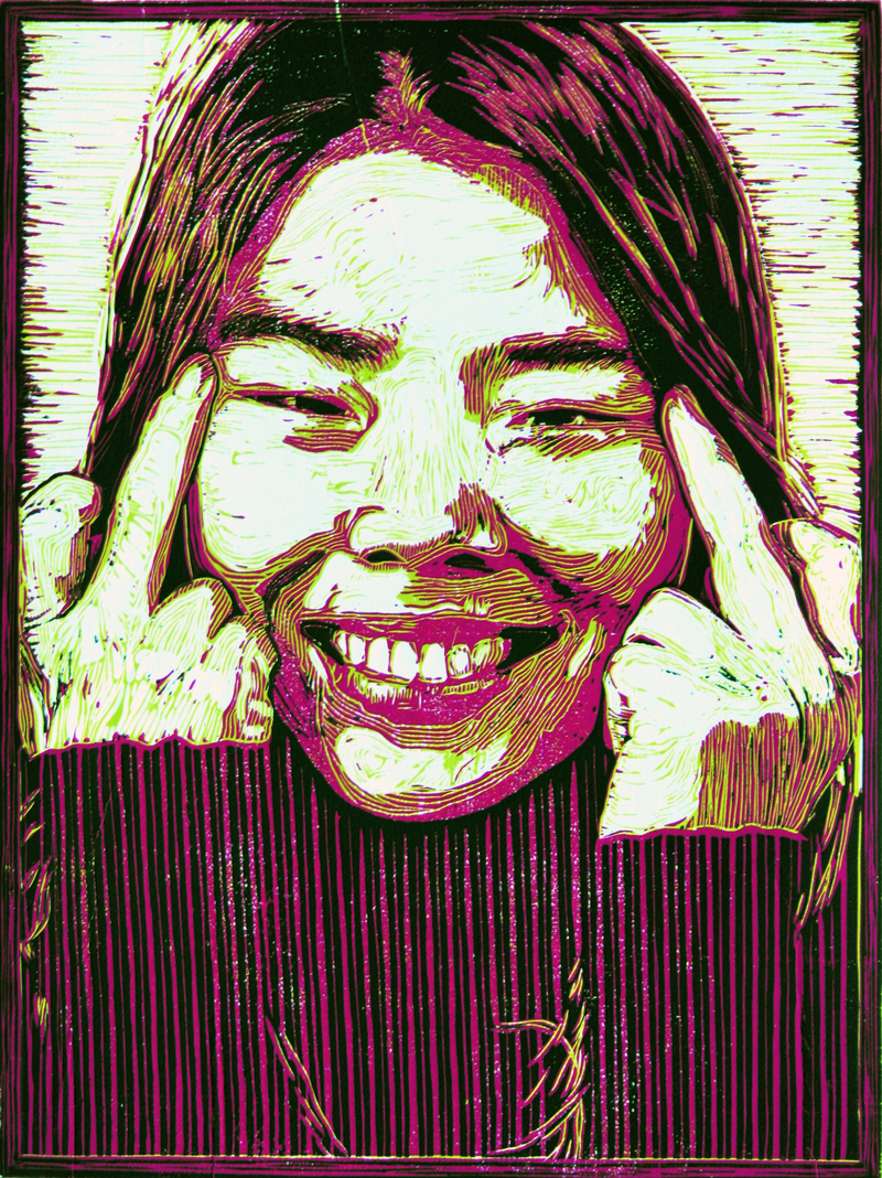 Eun-Joo (Selbstporträt), dreifarbiger Linolschnitt, 2011.