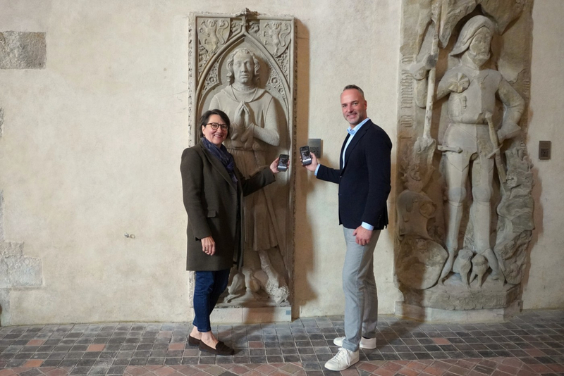 Dr. Susanne Kern und Julius Wagner scannen den QR-Code am Grabmal von Graf Eberhard I. von Katzenelnbogen