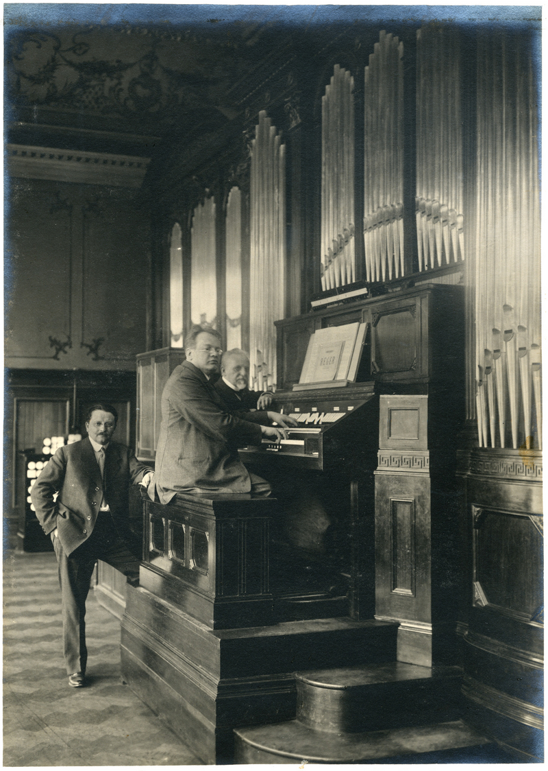 Max Reger an der Welte-Orgel im Welte-Saal zusammen mit Berthold und Edwin Welte (Quelle: Max-Reger-Institut Fotoalbum Elsa Reger Ft. 1913/21)