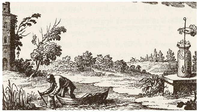 Bild: Die Zeichnung zeigt das von Alessandro Volta 1776 durchgeführte Experiment, mit dem er nachweisen konnte, dass es sich bei dem aus dem Seesediment aufsteigenden Gas um »brennbare Luft« handelte