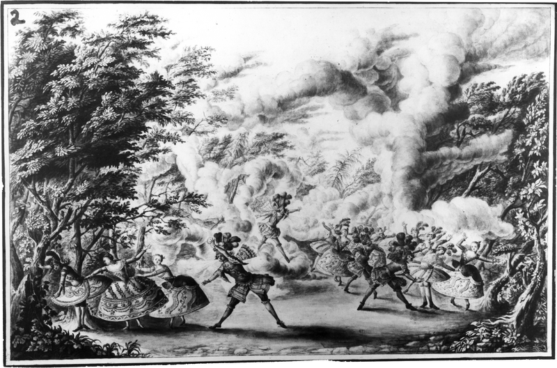 Szenenbild zum Ballett Les Amours de Flore et Zéphire, Fotografie einer verschollenen Zeichnung aus der sogenannten Durazzo-Sammlung, Universität Salzburg, Derra de Moroda Dance Archives, DdM f M 008_02