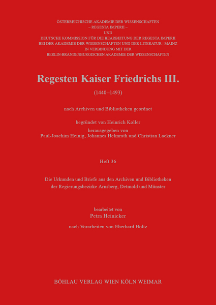 Regesten Kaiser Friedrichs III. (1440-1493). Nach Archiven und Bibliotheken geordnet. Heft 36: Die Urkunden und Briefe aus den Archiven und Bibliothek der Regierungsbezirken Arnsberg, Detmold und Münster, hrsg. von Paul-Joachim Heinig, Johannes Helmrath und Christian Lackner, bearb. von Petra Heinicker nach Vorarbeiten von Eberhard Holtz - Köln (2022)