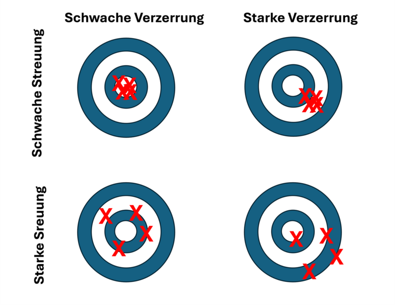 Die Begriffe »Verzerrung« und »Streuung« spielen hier eine zentrale Rolle? Wenn Sie mit Ihren Freunden Dart spielen gehen, können sie beide beobachten. Begnadete Dartspielerinnen treffen stets die Mitte der Zielscheibe. Keine Verzerrung, keine Streuung. Weniger talentierte Spieler treffen die Dartscheibe überall um das Bullseye herum, aber selten das Bullseye: eine hohe Streuung. Ein Glas Wein zu viel verzerrt den »Blick« und die Würfe streuen sich um einen Punkt weg vom Bullseye.