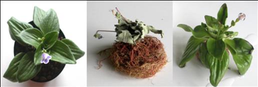 ›Craterostigma plantagineum‹ unter verschiedenen Bewässerungsbedingungen von links: im voll hydratisierten Zustand, im vollständig ausgetrockneten Zustand und 24 Stunden nach der Wiederbewässerung