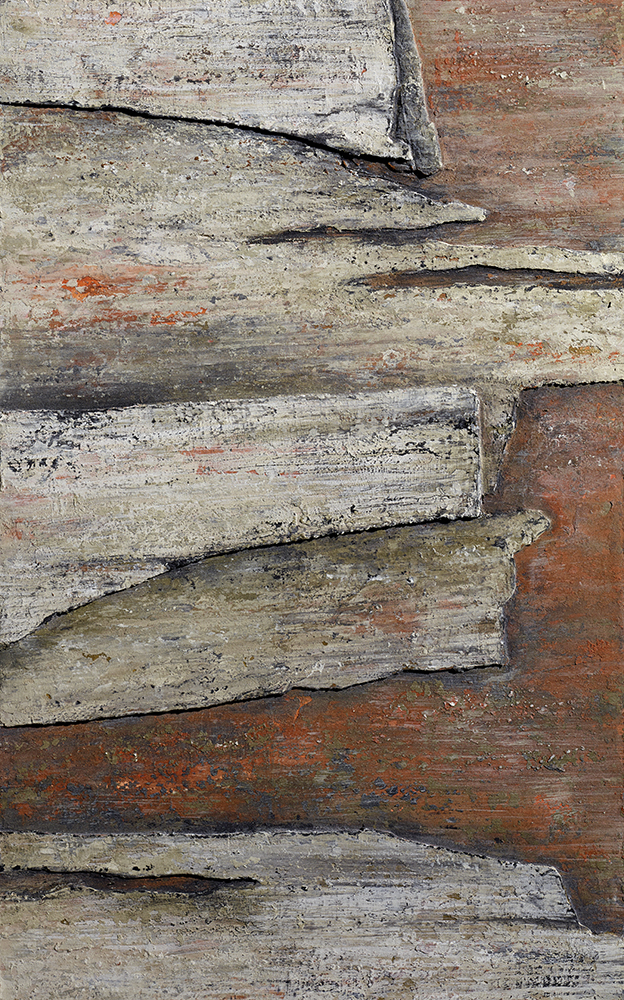 Der Fokus der Werkgruppe ›Makrorinden‹, die in der Akademie zu sehen ist, liegt auf teils großformatigen Tafelbildern, die sich durch eine reliefähnliche Oberflächenstruktur in Verbindung mit subtiler Farbgebung auszeichnen. Ausgehend von Skizzen entwickelt Nina Stoelting im Arbeitsprozess den finalen Bildaufbau. Der Materialauftrag erfolgt in zahlreichen Schichten, die von sehr pastos bis lasierend ein großes Spannungsfeld erzeugen und charakteristisch für die Arbeitsweise der Künstlerin sind.