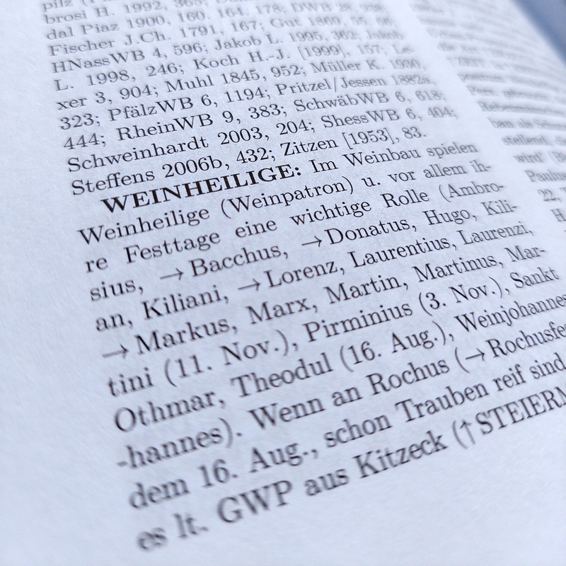Wörterbuch der deutschen Winzersprache. Ein europäisches Fachwörterbuch zu Sprache und Kultur des Weines. Im Auftrag der Akademie der Wissenschaften und der Literatur | Mainz hg. von Wolfgang Haubrichs, Maria Besse und Roland Puhl. 2 Bde, zus. 2496 Seiten, 119 s/w und 157 farb. Abb., 1 s/w Karten, Stuttgart: S. Hirzel Verlag 2022, € 438,00. ISBN 978-3-7776-2234-7.
