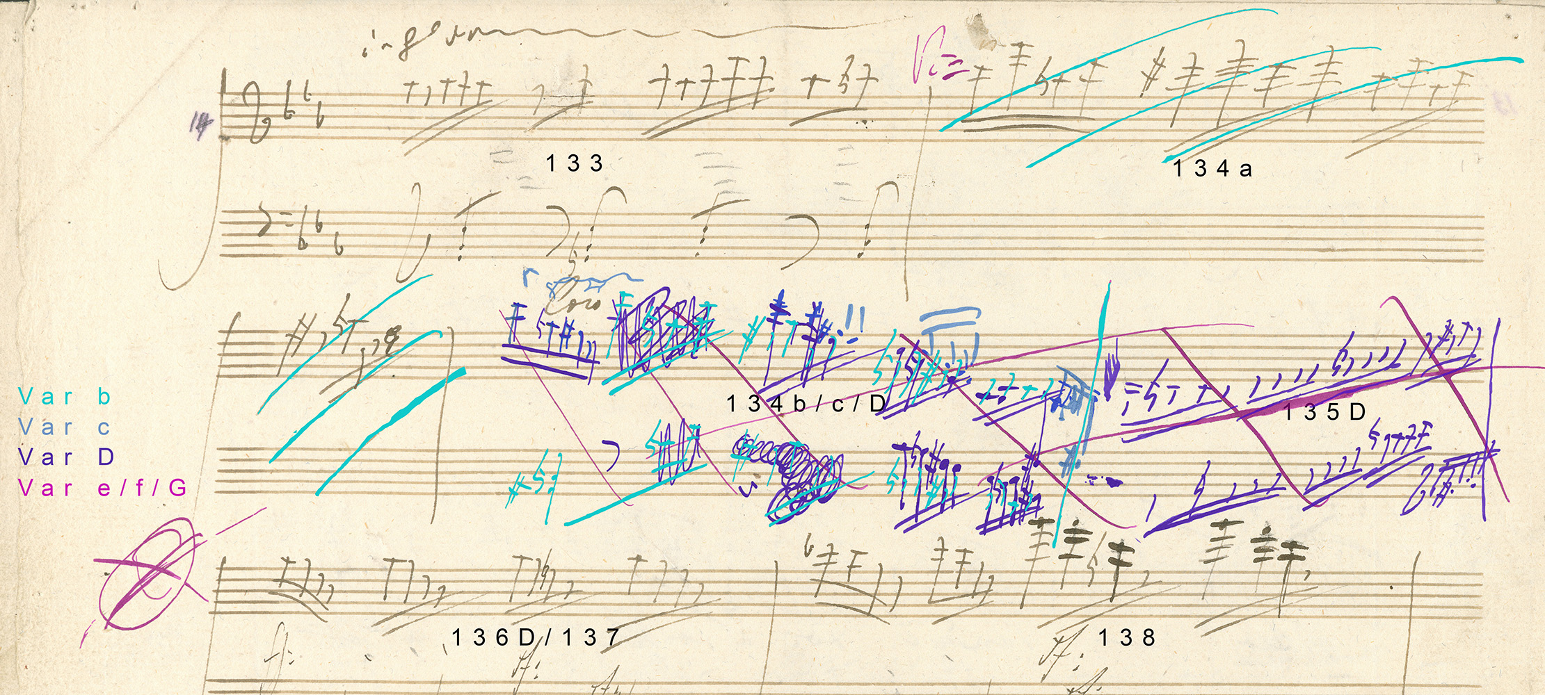 L. van Beethoven: Sonata for piano (C minor) op. 111, I. movement, Maestoso, m. 133 - 135D (BeethovenHaus, Bonn; BH 71), with coloured highlighting of the different text layers.