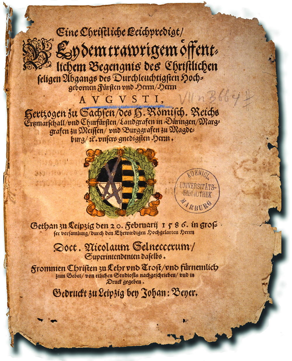 [Translate to English:] ›Handkoloriertes Titelblatt der Leichenpredigt auf August Kurfürst von Sachsen (1526-1586)‹. Foto: Forschungsstelle für Personalschriften.