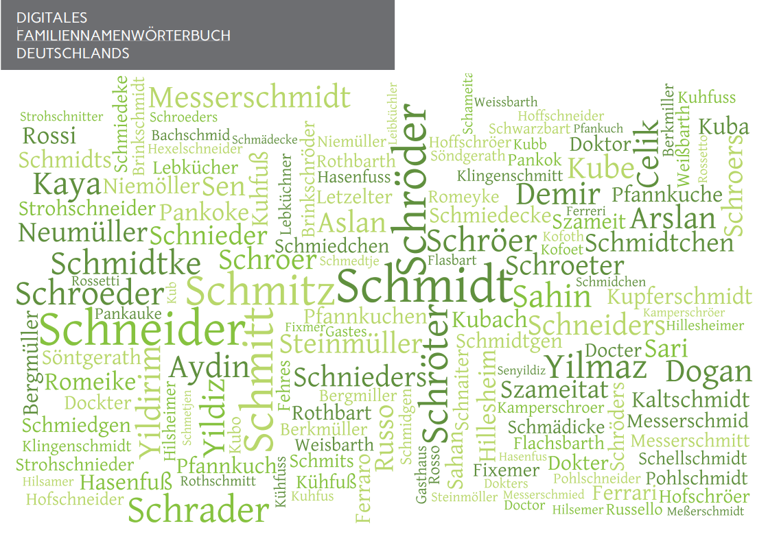 An der Mainzer Akademie der Wissenschaften und der Literatur wird in Kooperation mit der Technischen Universität Darmstadt ein digitales Familiennamenwörterbuch erarbeitet, bei dem erstmals der komplette Grundbestand der derzeit in Deutschland vorkommenden Familiennamen (auch der fremdsprachigen) lexikographisch erfasst, kartiert und, u.a. mithilfe des Kartenbefunds, etymologisiert wird.