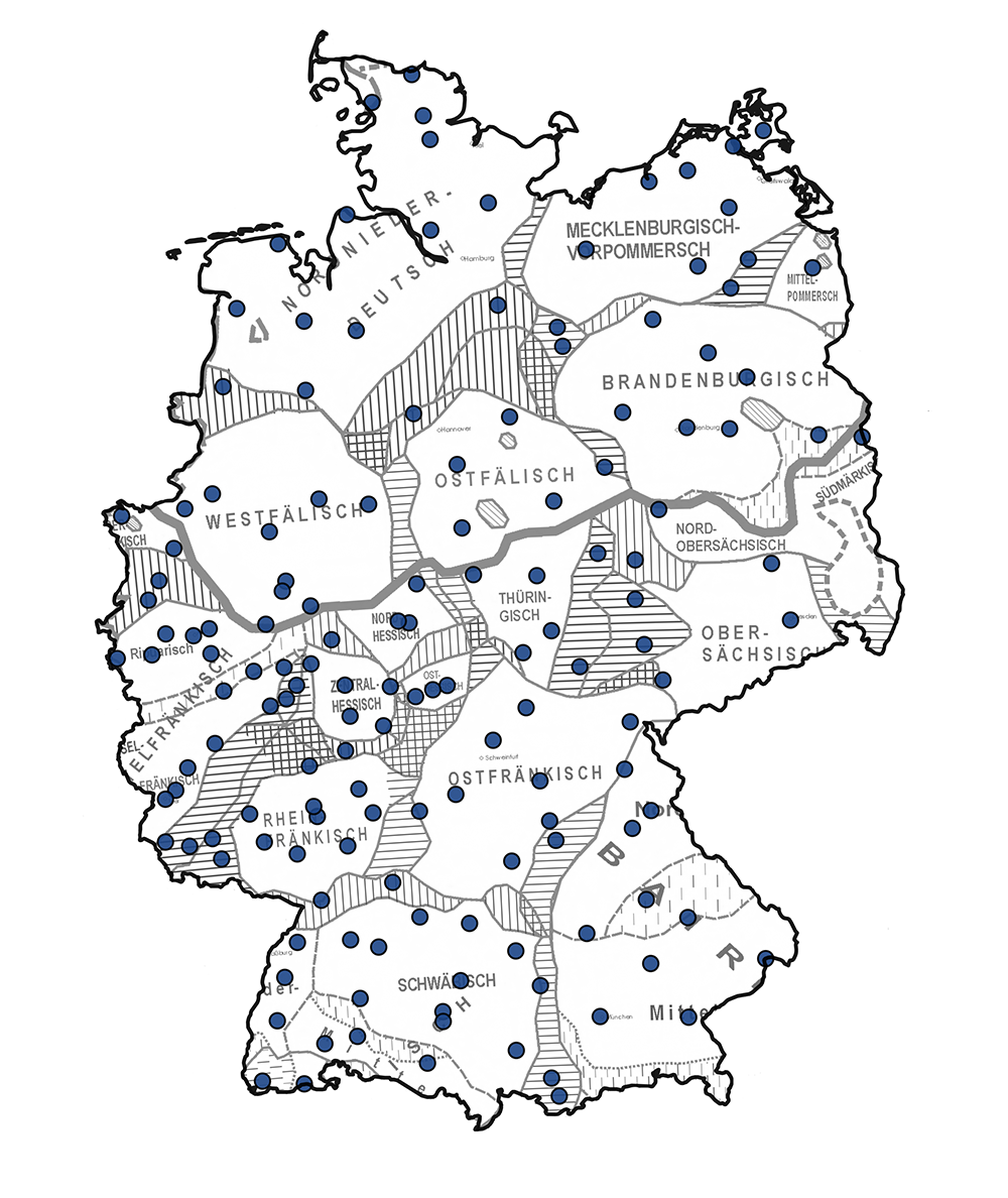 ›Ortsnetz der Neuerhebung regionalsprachlicher Daten im Projekt Regionalsprache.de‹. Bild: Roland Kehrein; Hintergrund: Dialekteinteilung nach Peter Wiesinger (1983).
